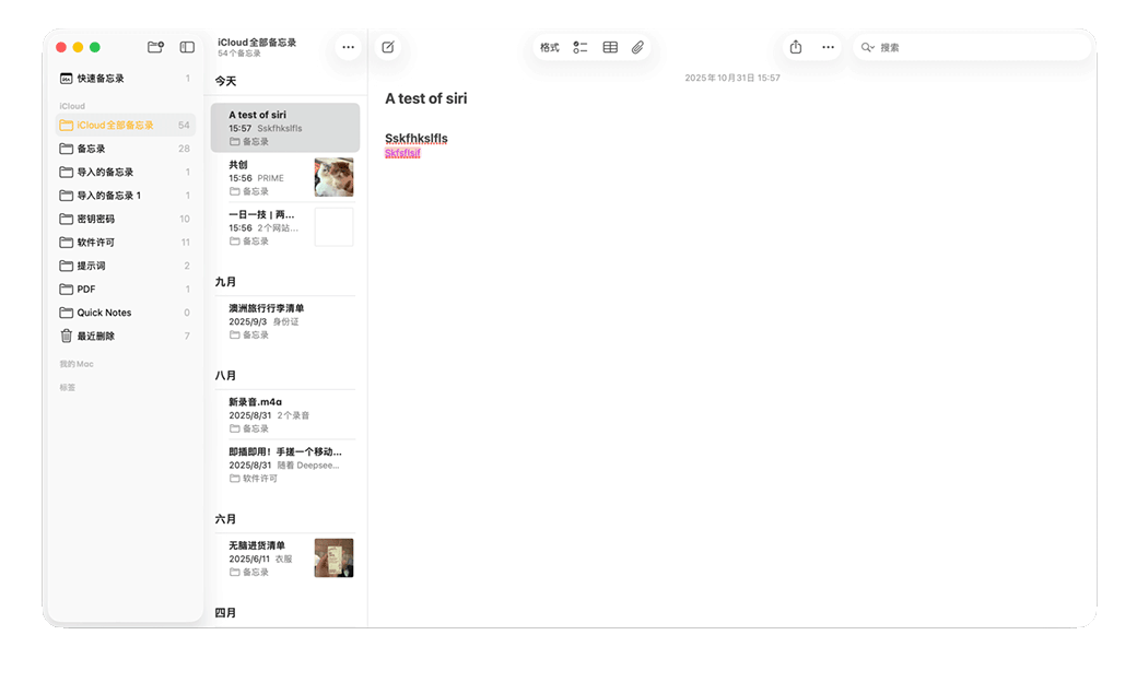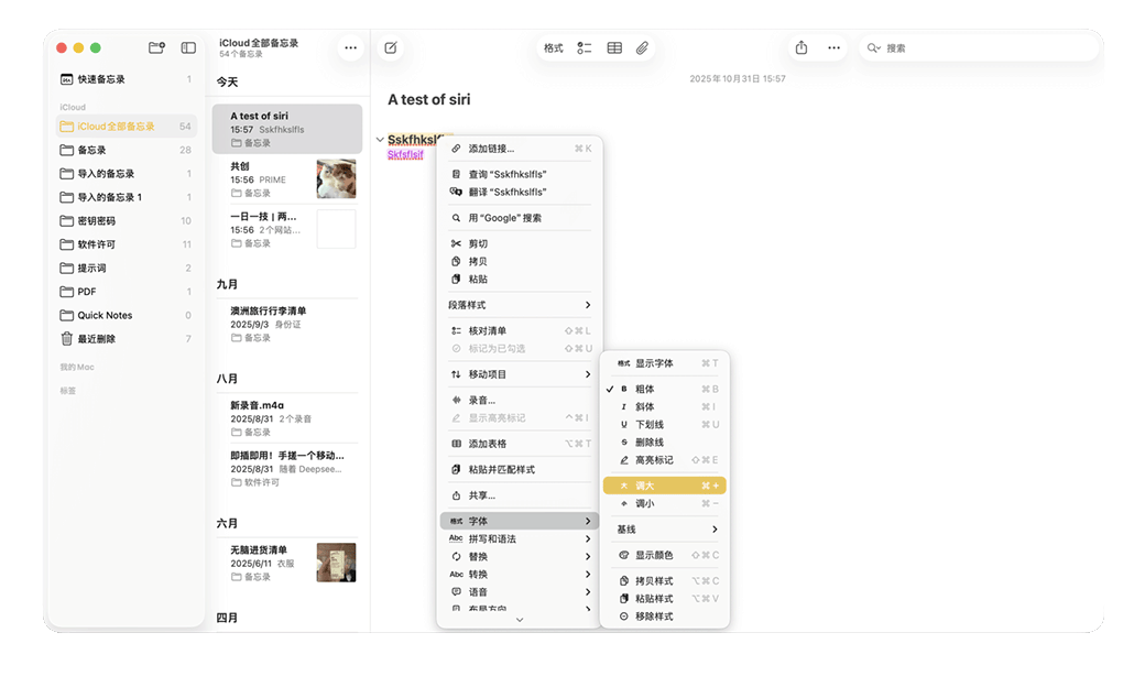 备忘录采用的是富文本编辑器,因此不能通过 Markdown 或类似 Notion 的快捷方式调整文本格式,而是需要像使用 Word 一样,先选中文本,再调整为对应的格式。