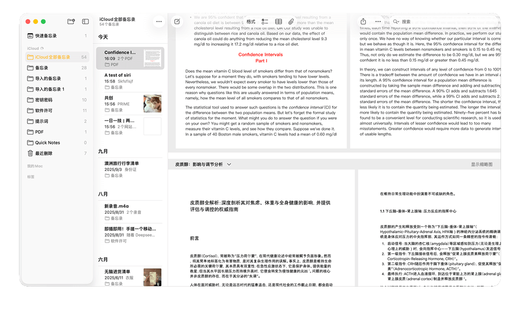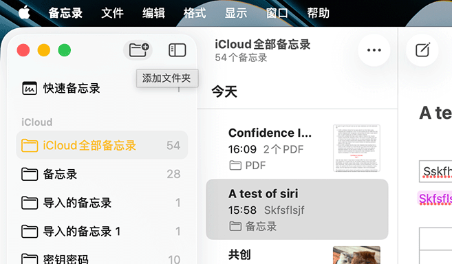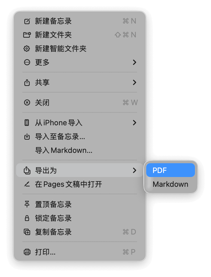 此外,你还可以将备忘录导出为 PDF 文件,只需选中想要导出的备忘录,点击「菜单栏 > 文件 > 导出为 PDF」即可。