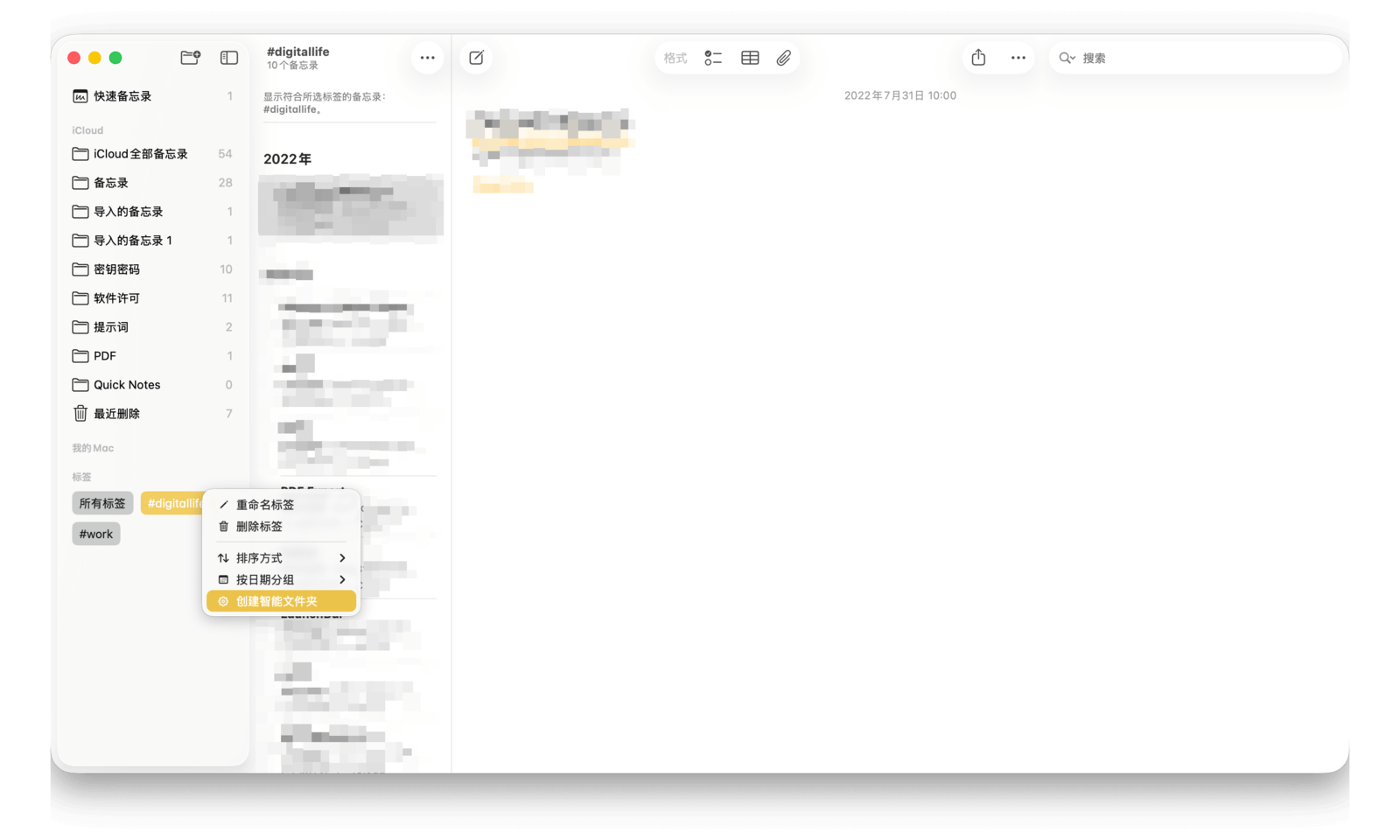 如果某个标签下的内容过多,也可以直接在标签页面中将其转换成智能文件夹。之后,该智能文件夹将自动按你选择的标签筛选备忘录,无须重复操作。