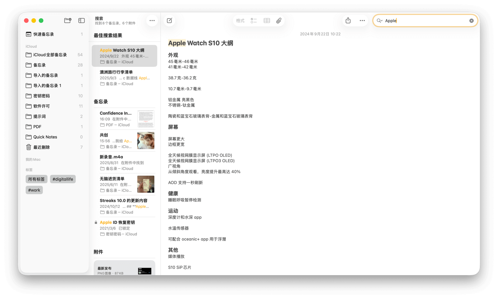 如果你平时没有整理的习惯,已经堆积了太多未分类和无标签的备忘录,又想找到许久前的一篇记录,也无需担心。你可以通过最上方、最右侧的放大镜按钮使用「搜索」功能,它不仅支持搜索备忘录里的文字内容,还可以搜索附件。