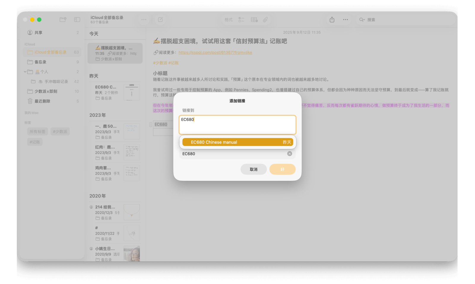 在备忘录中使用双向链接的方式与其他笔记应用不同,它没有专门的菜单选项或触发词,而是通过「添加链接」的入口实现。选中需要添加双向链接的文本,在右键菜单中选择「添加链接」或使用键盘快捷键「⌘Command + K」。在弹出的窗口中,于「链接到:」一栏直接输入想链接的备忘录标题,备忘录会根据关键词匹配建议,选中后点击「好」即可完成创建。