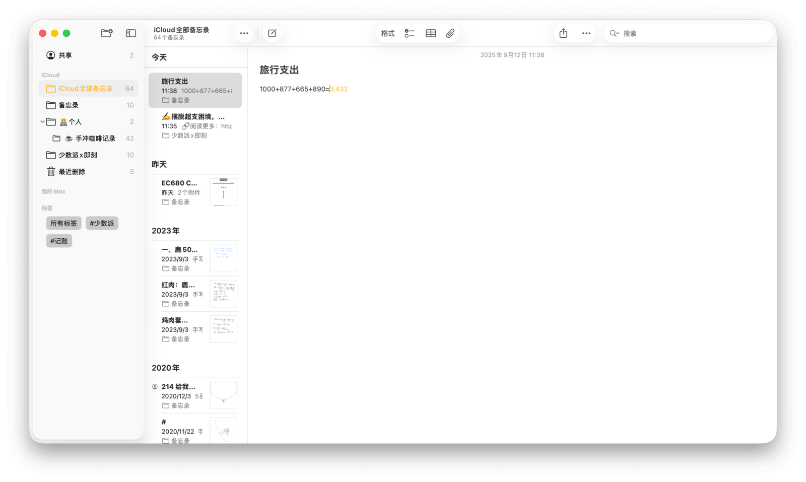 以旅行花费汇总和摊销计算为例:一次与朋友们的旅行结束后,我想算一下总共花了多少钱,以及每人平均分摊多少。于是,我先在笔记中依次记录每项支出的费用,然后加总计算总额,最后再根据人数分摊。