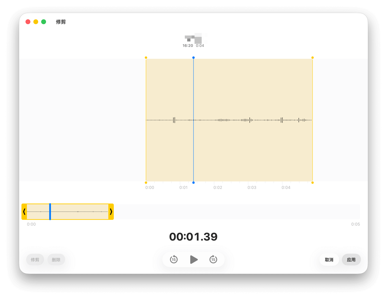 在这个界面中,你可以看到缩微波形图的两端出现了带箭头的黄色控制柄。将控制柄的两端分别移动到待删除部分的开头和结尾处,便可以选择「修剪」或「删除」。编辑完成后,可以选择「取消」或「存储」操作。