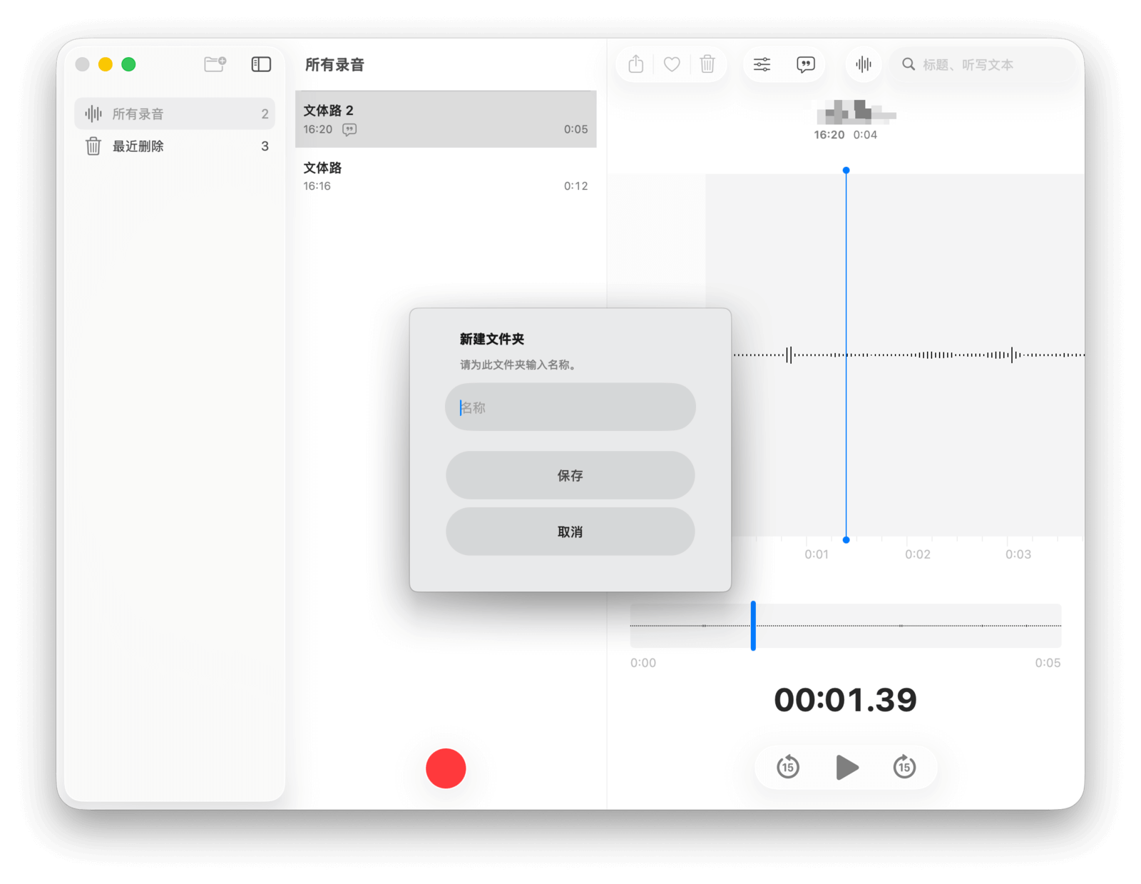 在「语音备忘录」中,你可以创建文件夹来整理录音文件。点击左上角的侧边栏切换按钮进入文件视图,再点击右下角的「新建文件夹」图标,为文件夹输入名称并选择「存储」,即可创建新的文件夹。