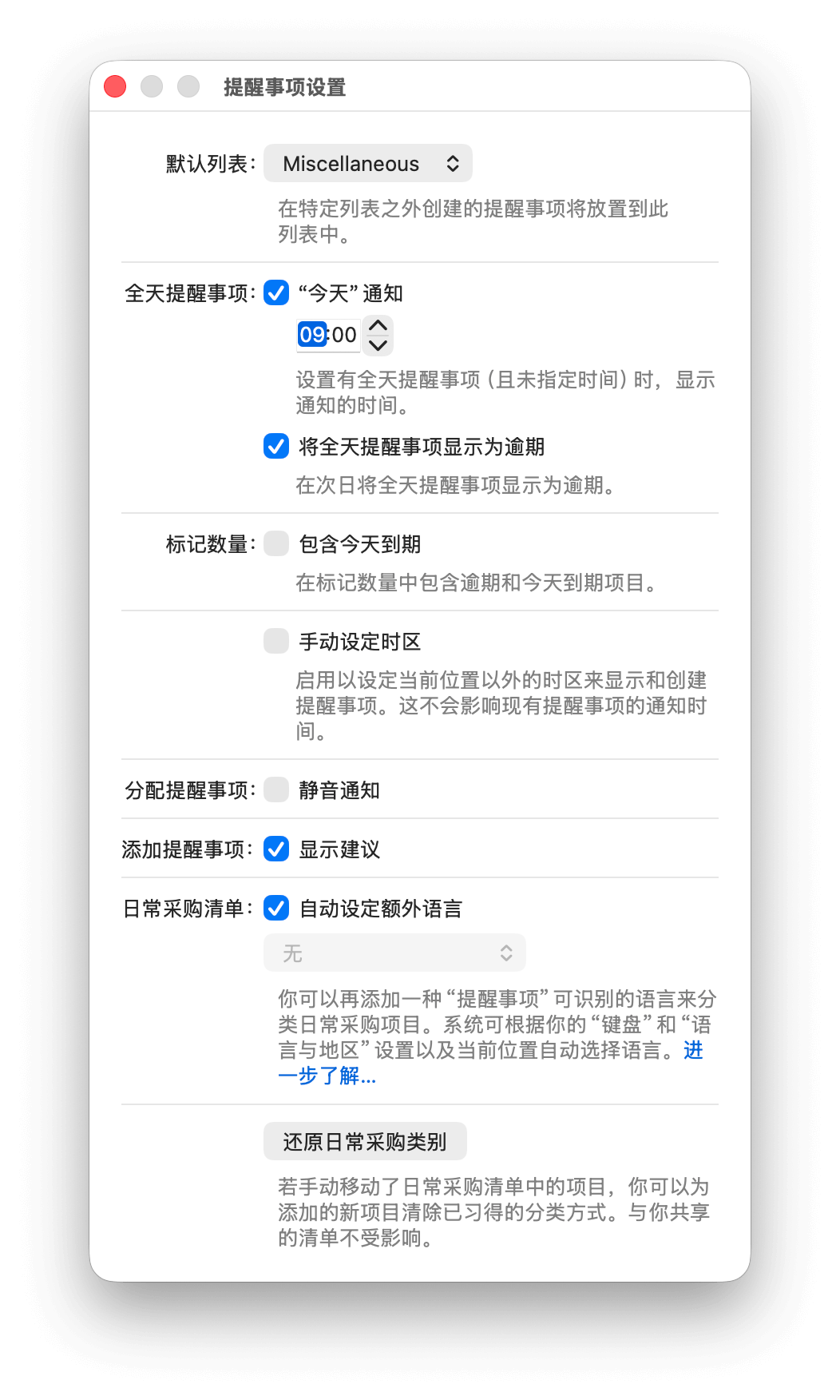 打开「提醒事项」,在菜单栏中前往「提醒事项 > 设置...」。「默认列表」指的是新建提醒事项时,任务默认归属的列表。