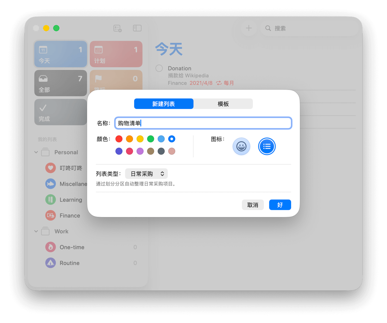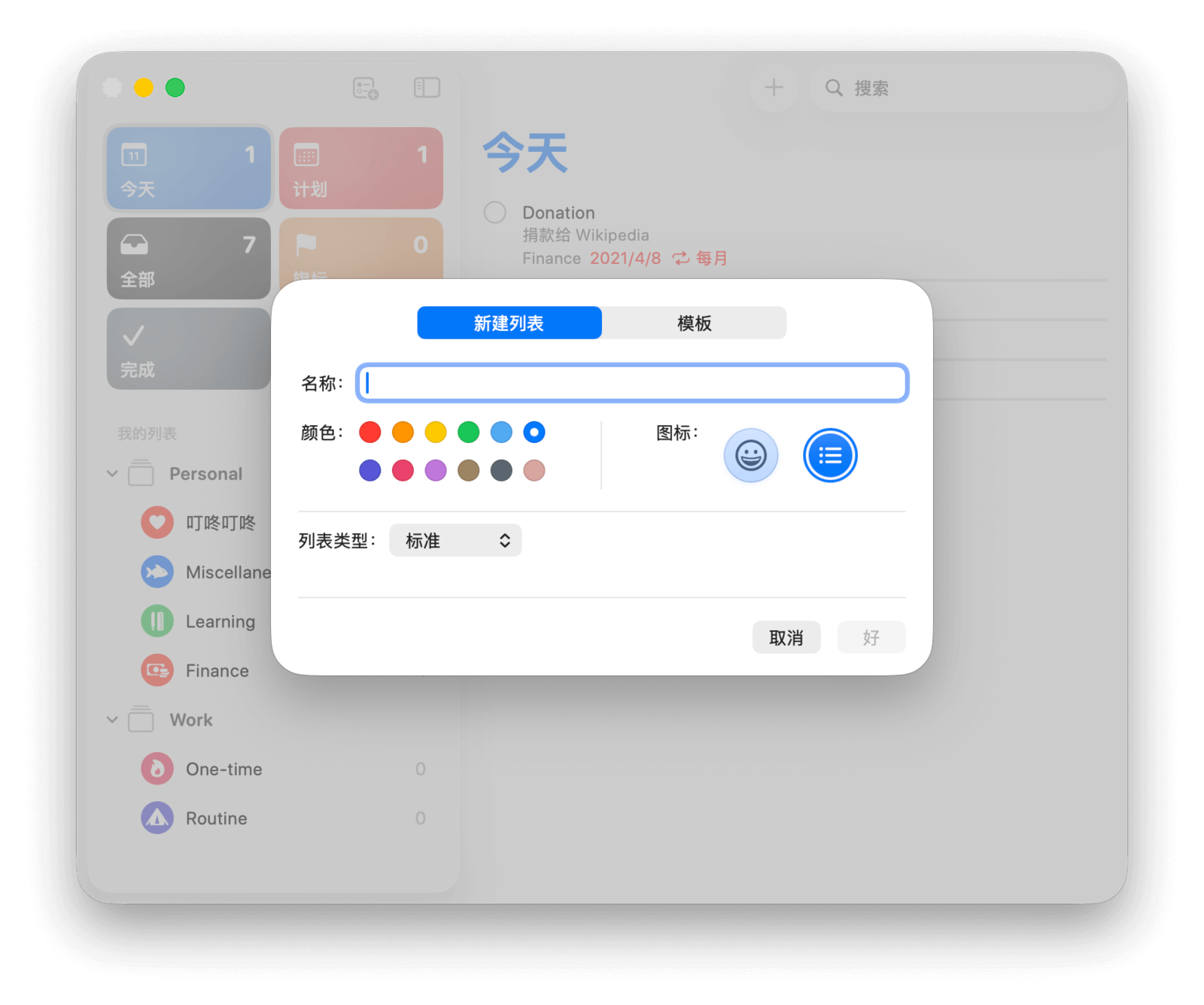 在添加任务前,你首先需要创建列表来为任务分类。打开「提醒事项」,点击「我的列表」侧边栏右上角的「添加列表」按钮,即可打开新建列表窗口。你可以为列表设定合适的名称、颜色和图标,方便区分。