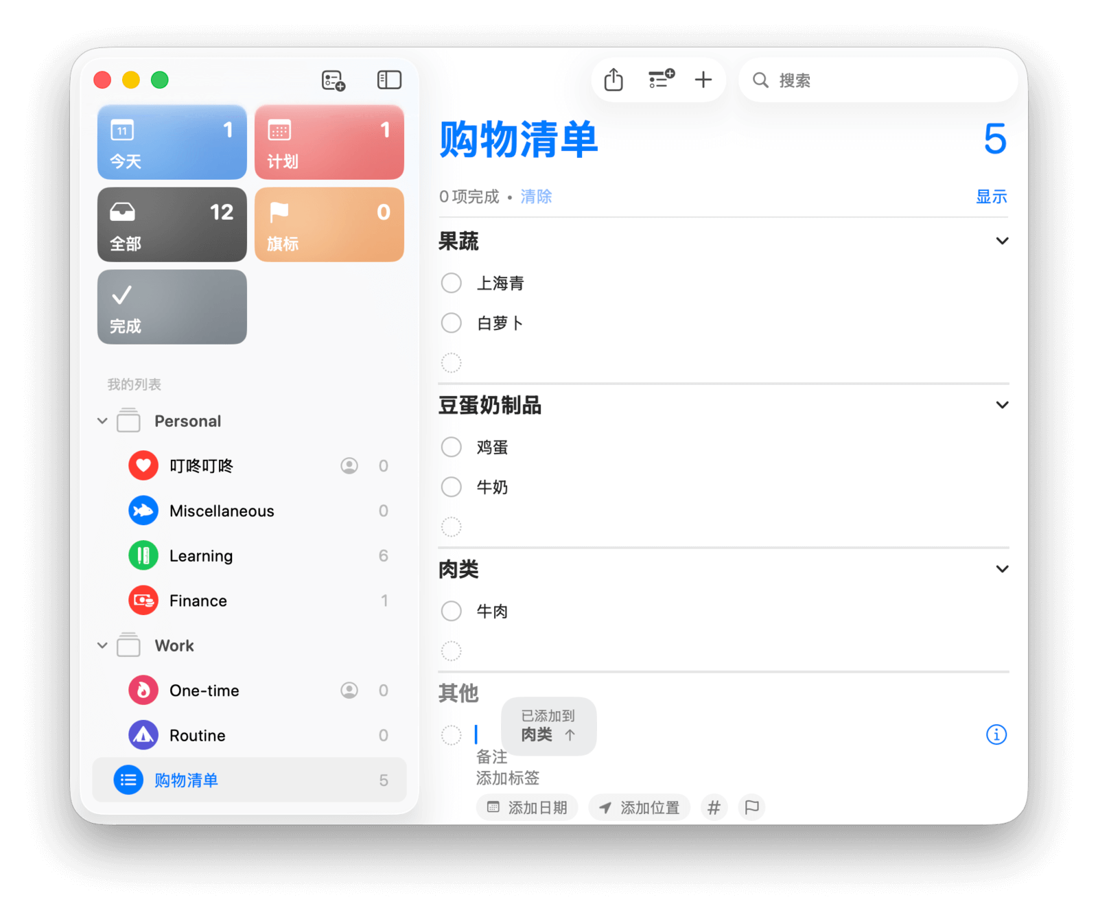 如果某些项目未能自动分类,你可以手动为它们归类。「日常采购」列表会记住你的操作,并根据你的习惯,在未来自动划分同类项目。