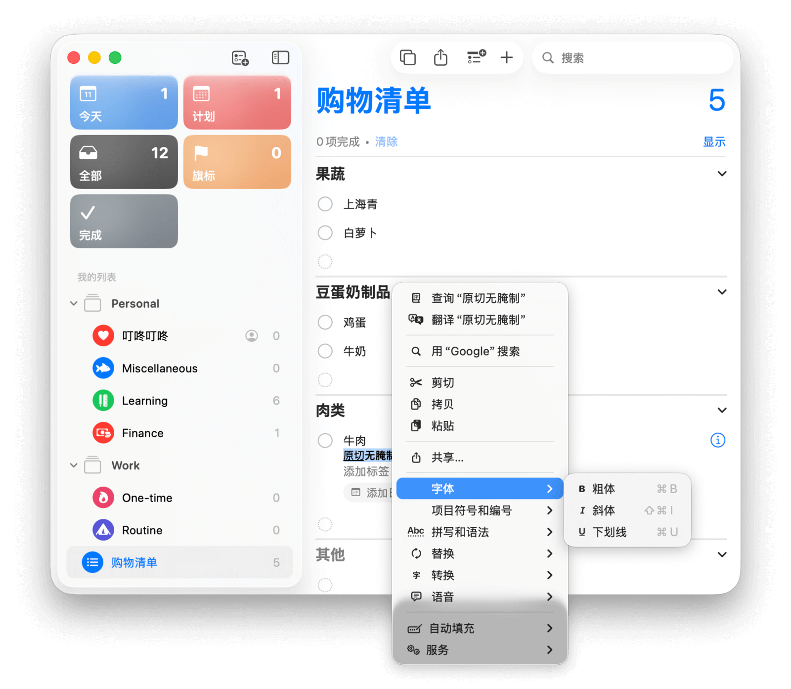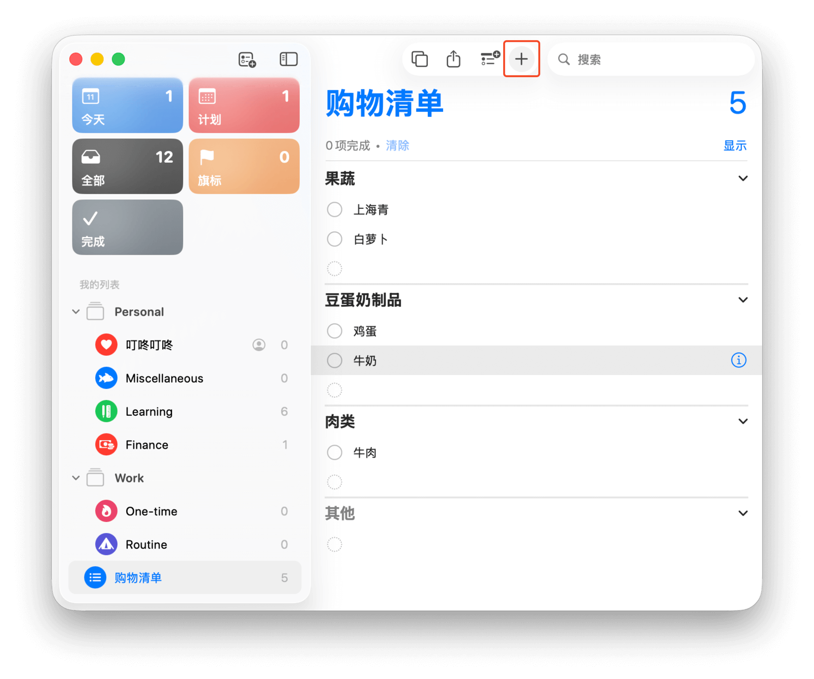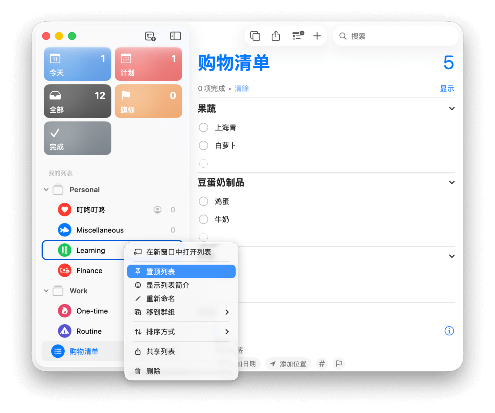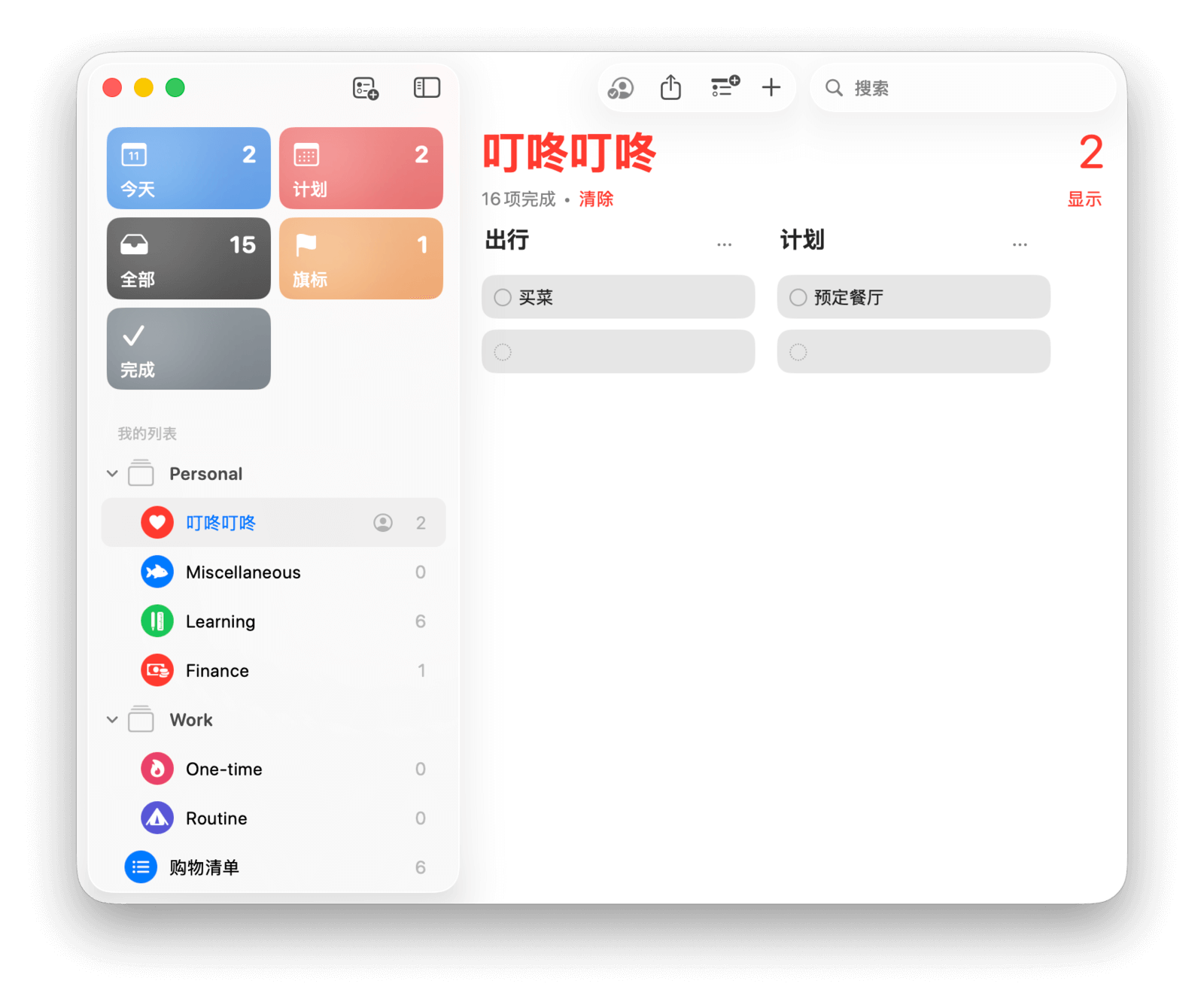 在应用主界面,左侧边栏是系统自带的五个智能列表——「今天」「计划」「全部」「旗标」和「完成」,以及你手动创建的列表。右侧则显示所选列表中的所有任务。