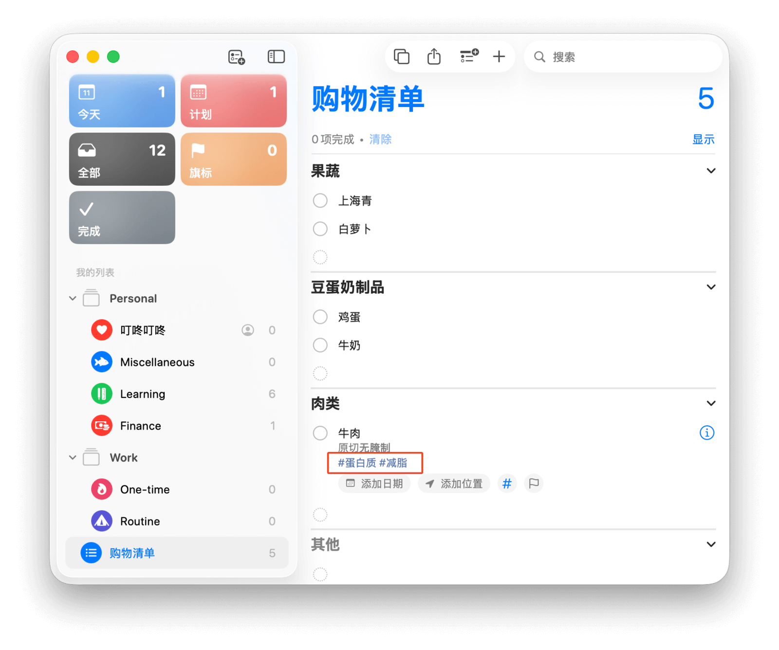 你可以为提醒事项设定标签,方便分类。在「添加标签」一栏,你可以选择已有标签或新建标签。回到买牛奶的例子,你可以给这个任务打上「购物」标签。下次去超市时,只需查看带有「购物」标签的任务,就能确保不会遗漏。