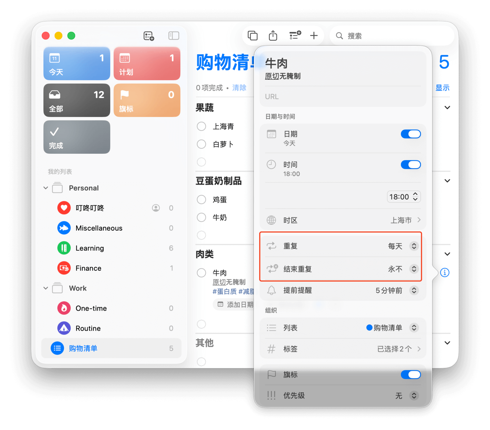 指定日期后,你还可以点击任务右侧的「i」图标,为任务设置重复频率,这样便无需再手动创建相同的任务。如果你打算今天傍晚去买牛奶,可将「日期」设为今天,「时间」设为晚上六点。如果你每周都需要买牛奶,则可在「重复」里选择「每周」。