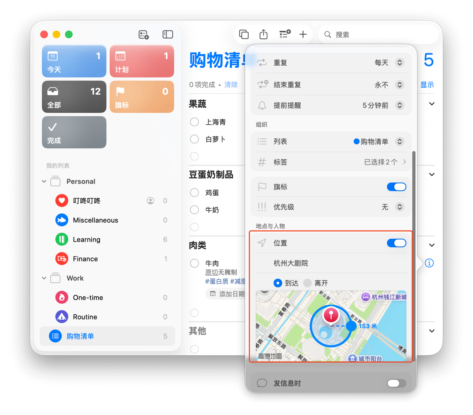 通过「添加位置」并选择一个地点,「提醒事项」就会在你到达或离开该位置时提醒你。你可以在此处选择常去的超市,这样你一到超市就会收到提醒。