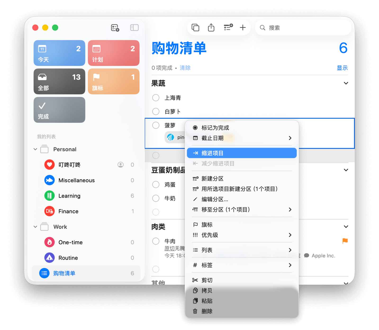 创建任务后,右键点击它,在弹出菜单中选择「缩进项目」,即可将其变为上方任务的子任务。子任务也可以设置独立的「日期」「时间」和「标签」等信息。