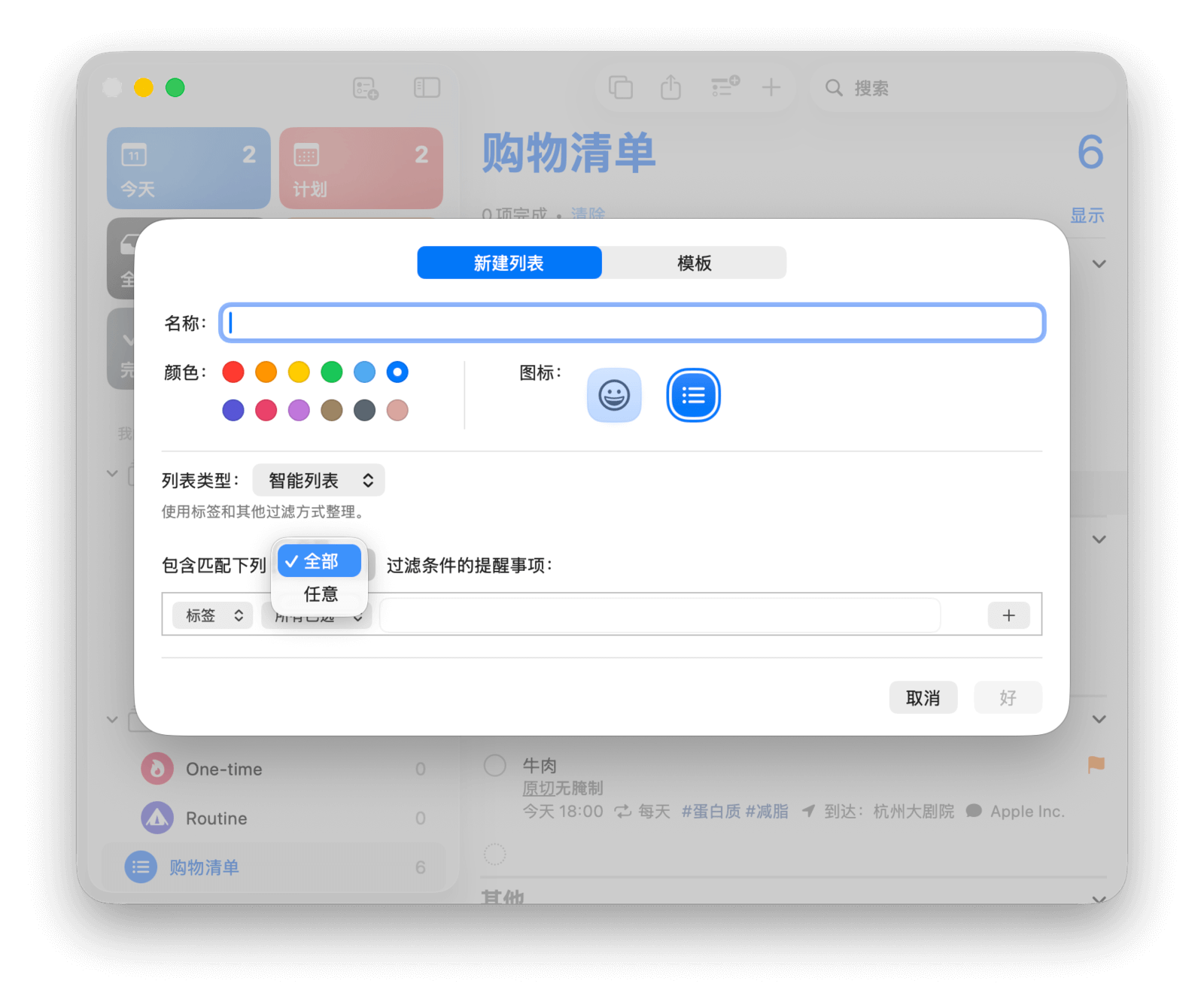 从 macOS 13 开始,创建智能列表时,你可以设置任务需「符合所有条件」或「符合任意条件」来进行过滤。