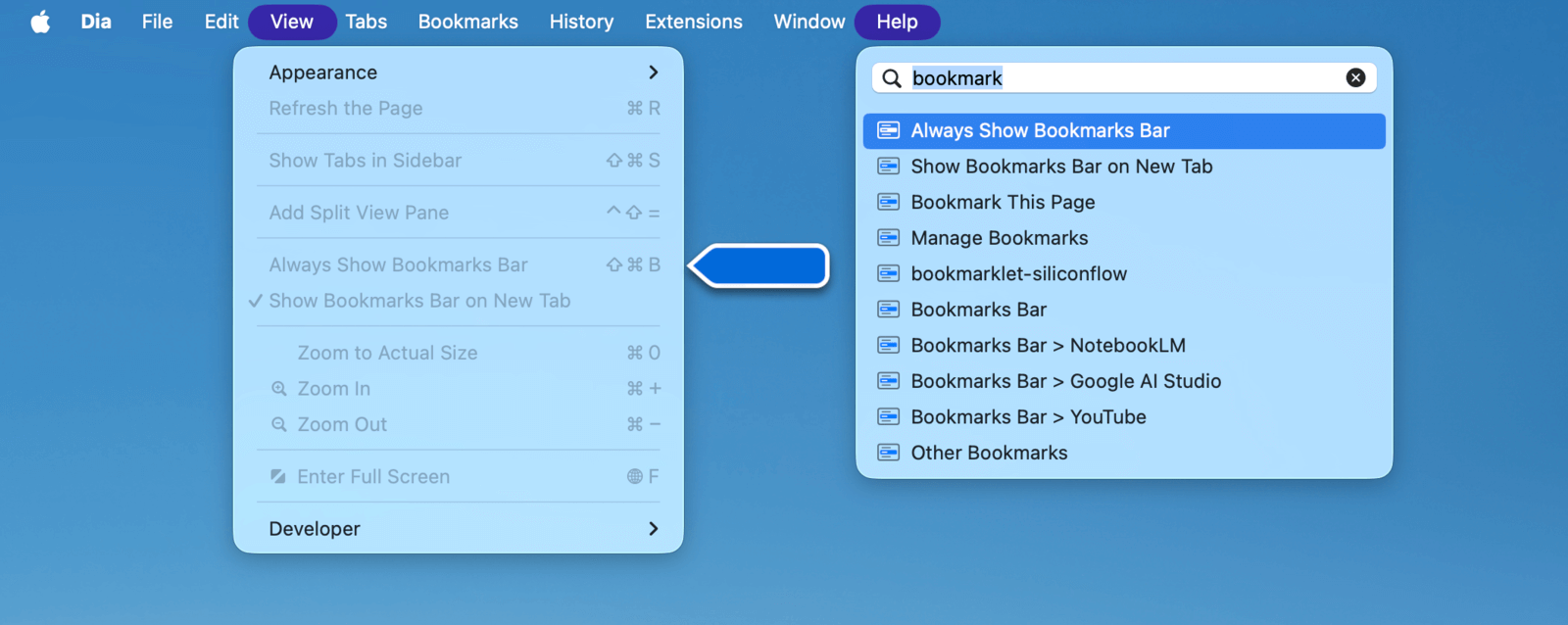 App 菜单的内容由开发者设定,但大多遵循一定规范,且必定包含「帮助」菜单。App 菜单几乎囊括了应用的所有功能,当功能繁多、层级复杂时,直接在「帮助」菜单的搜索框里输入功能名称,系统便会高亮提示其所在位置,非常高效。