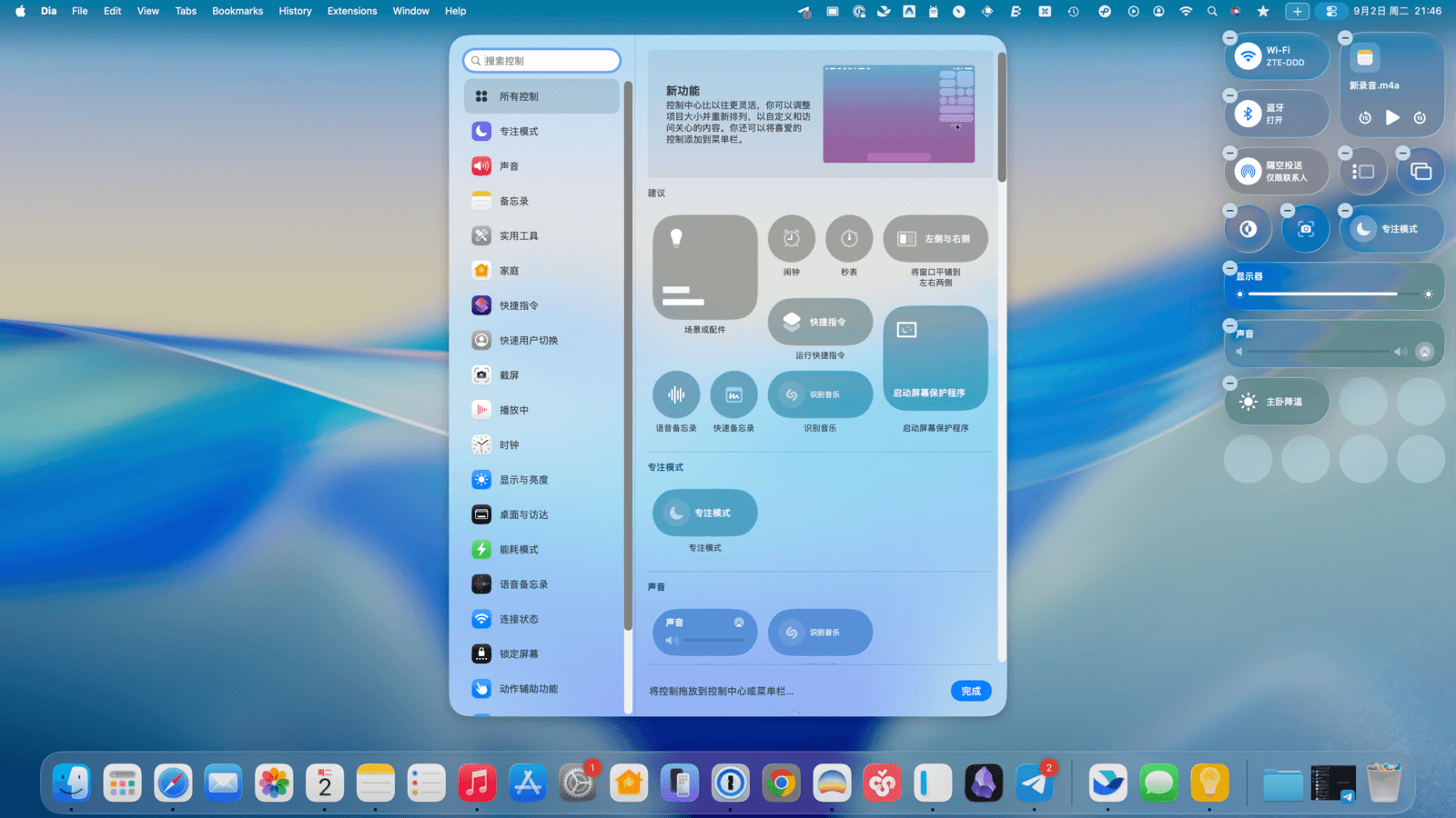 控制中心与 iOS 类似,是各类快捷开关的集合地。点击 Wi-Fi、蓝牙等模块旁的箭头,可以展开二级菜单进行快速选择;若需更多设置,菜单底部通常留有通往「系统设置」的入口。在 macOS Tahoe 中,你还可以点击「编辑控制」来新增项目、调整布局,甚至创建多个控制中心页面,并通过不同图标从菜单栏快速调用。