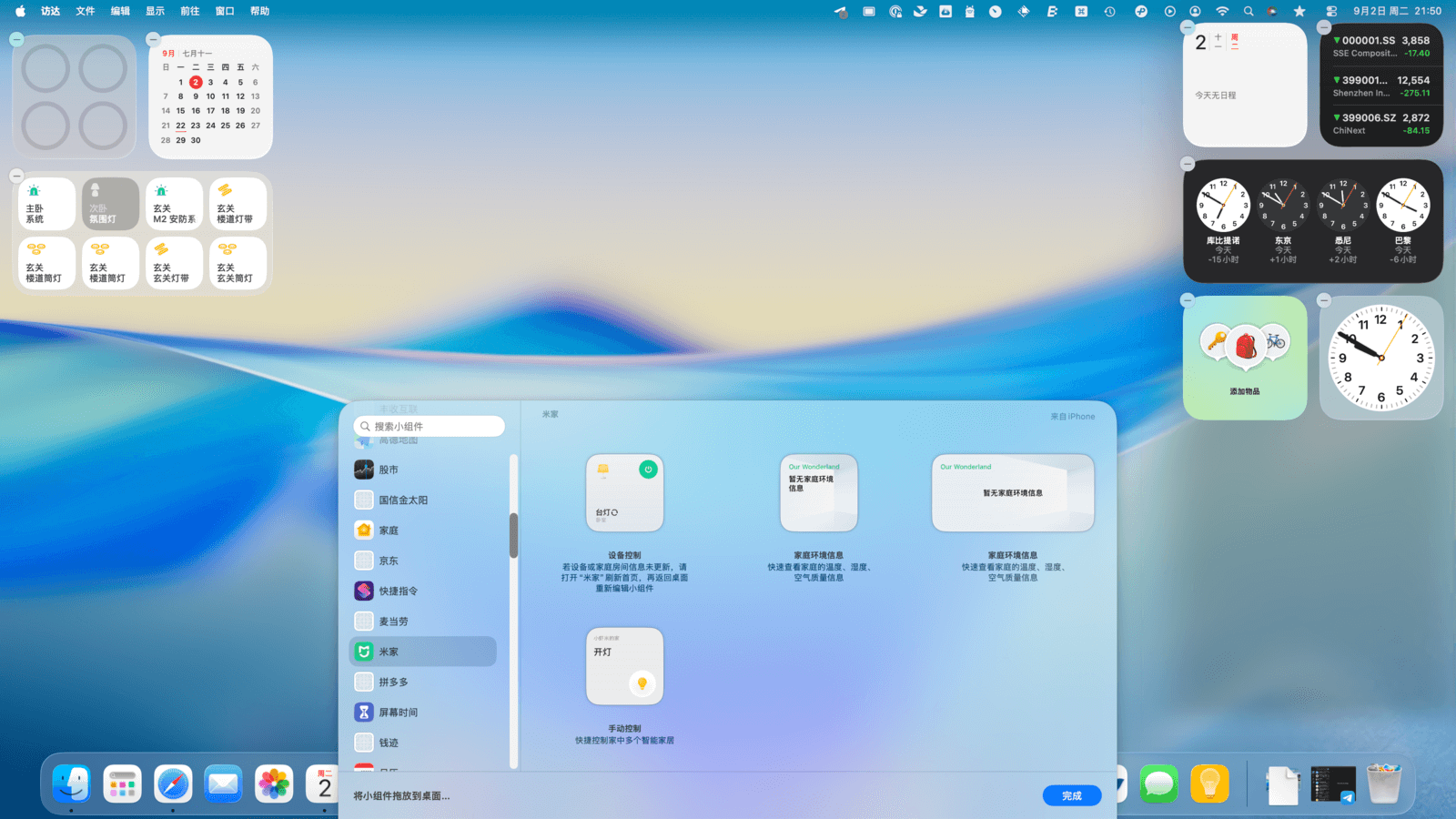 通知中心则整合了通知历史和小组件。点击底部的「编辑小组件」,就能像在 iOS 设备上一样进行增删和调整,甚至可以将 iPhone 上的小组件直接添加到 Mac 桌面上。