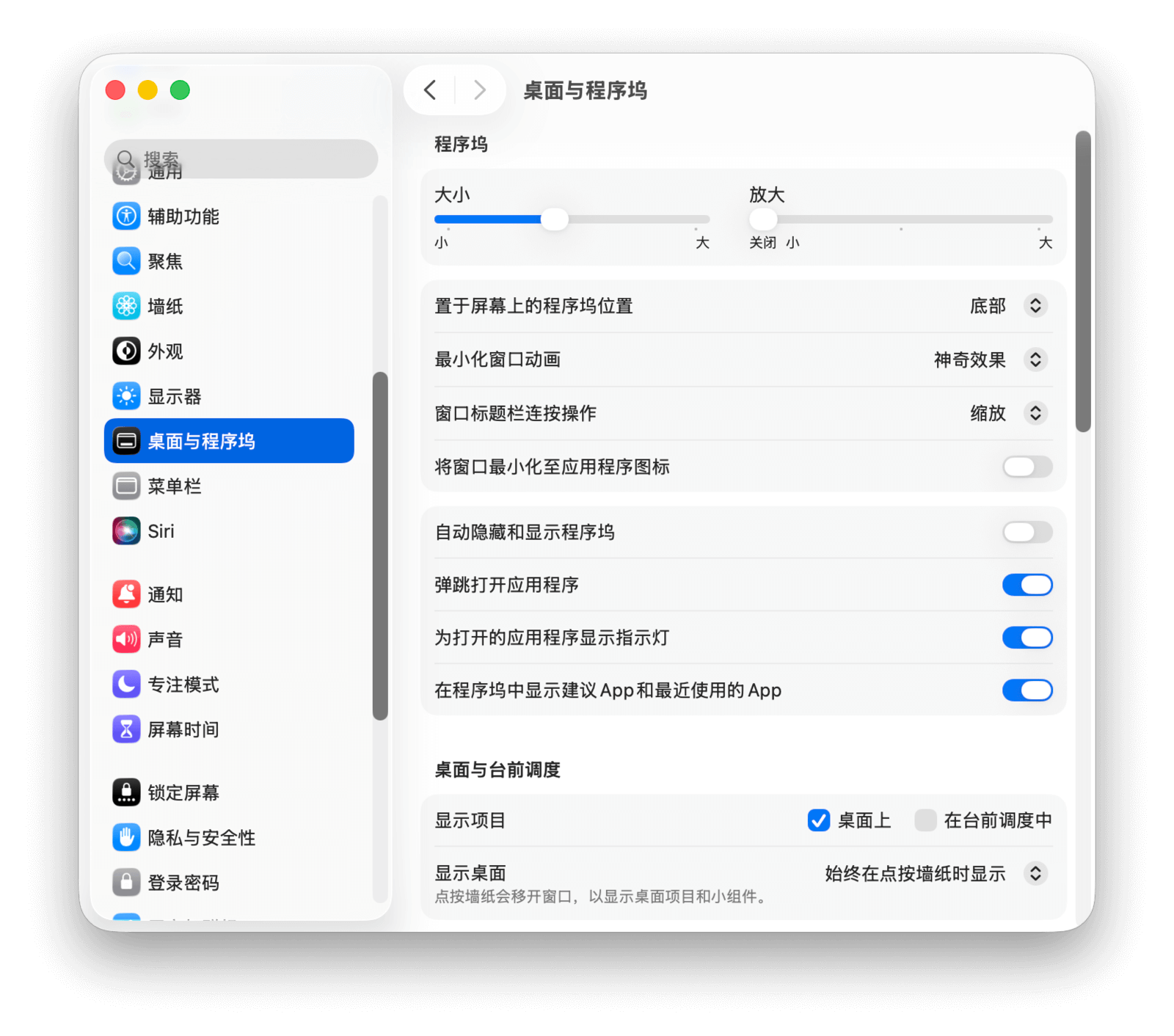 和菜单栏一样,程序坞的多数显示效果都可以在「系统设置」>「桌面与程序坞」中进行调整。