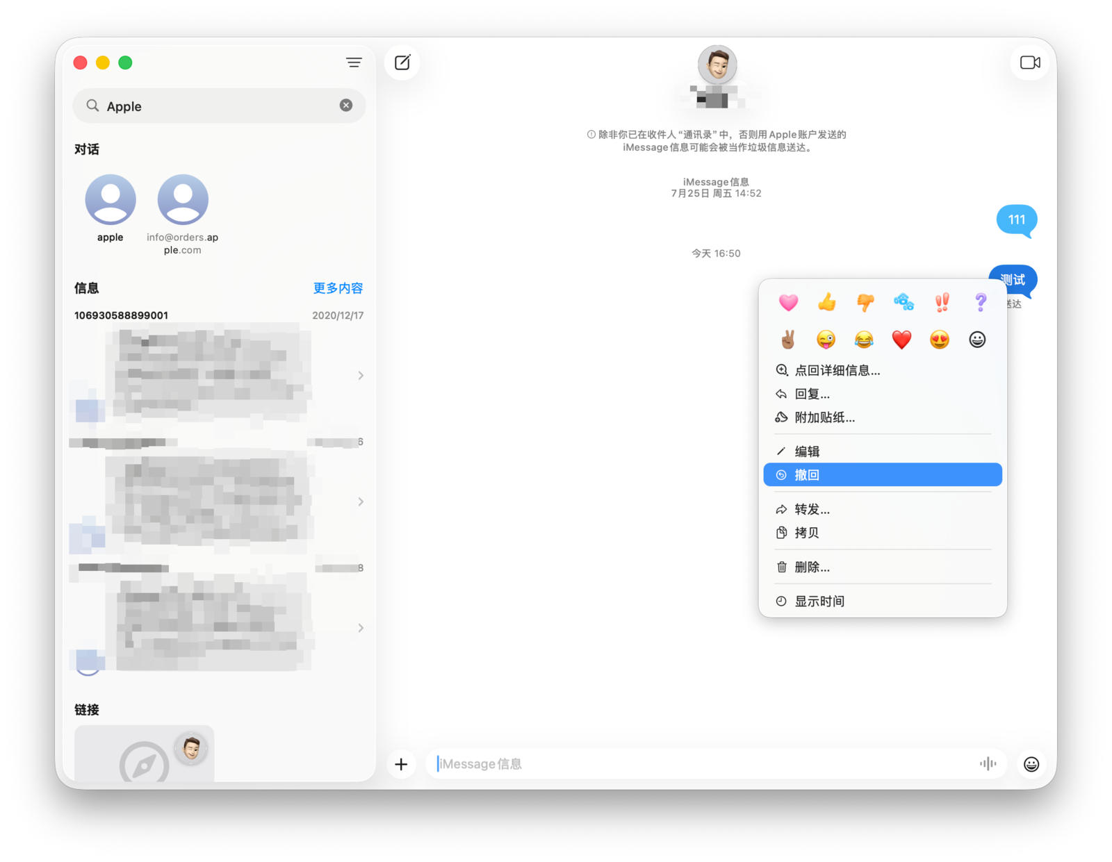 除了文字,iMessage 信息还可以发送语音、贴纸、拟我表情等丰富的内容,甚至支持第三方应用的交互功能。