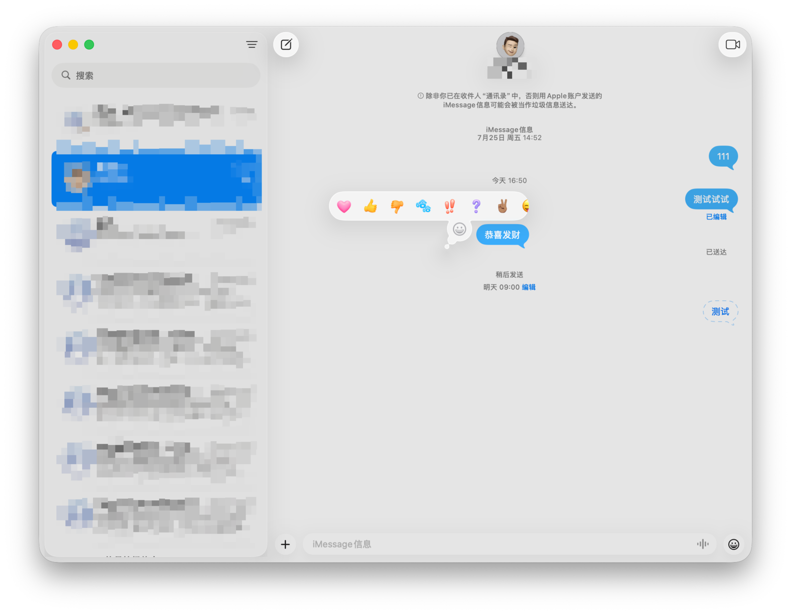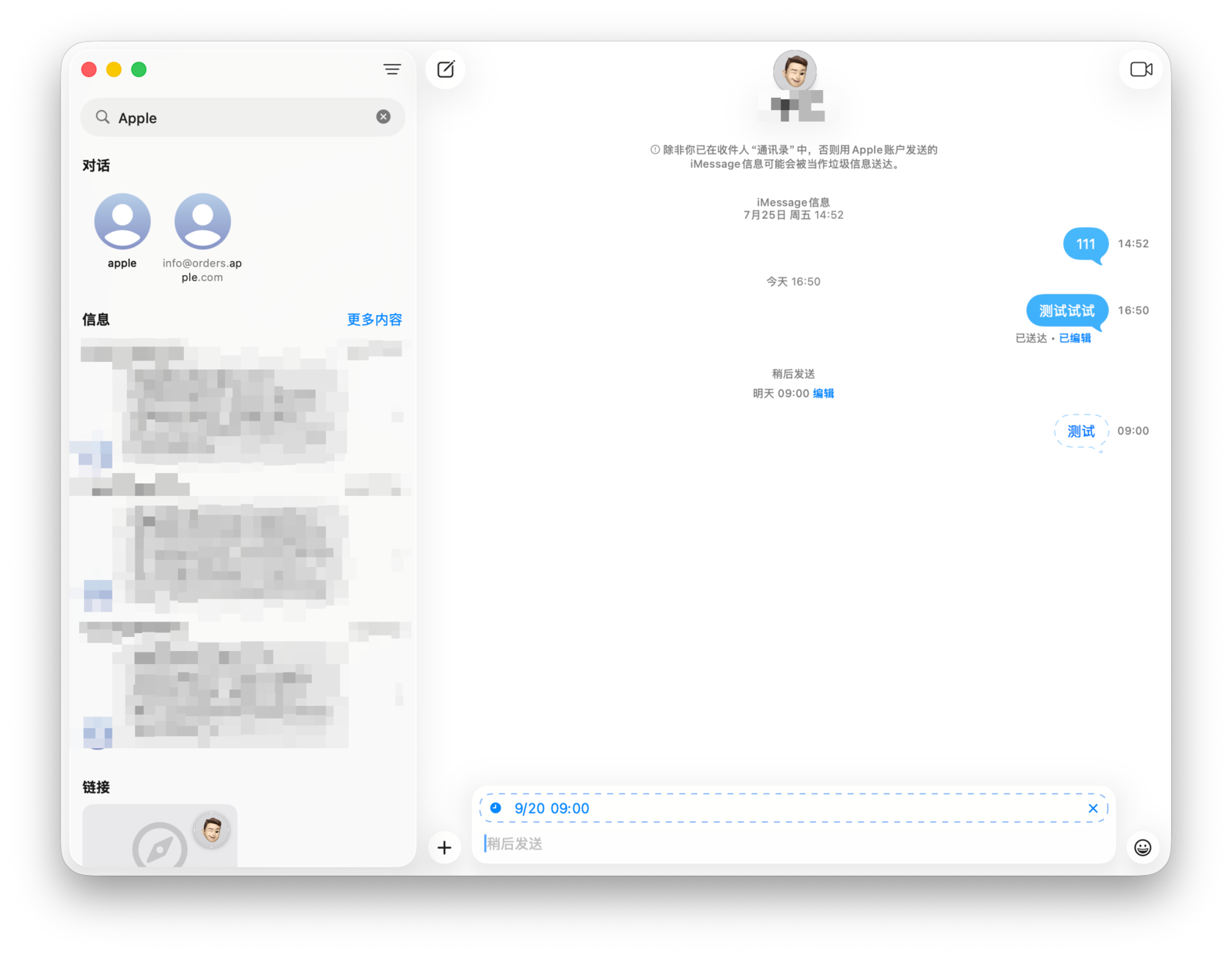 如果你想定时发送信息,可以在输入文本后,点击对话框左侧的加号(+)按钮,选择「更多」>「稍后发送」。设置好日期和时间后,按下回车键,这条信息就会以虚线气泡的形式等待发送。