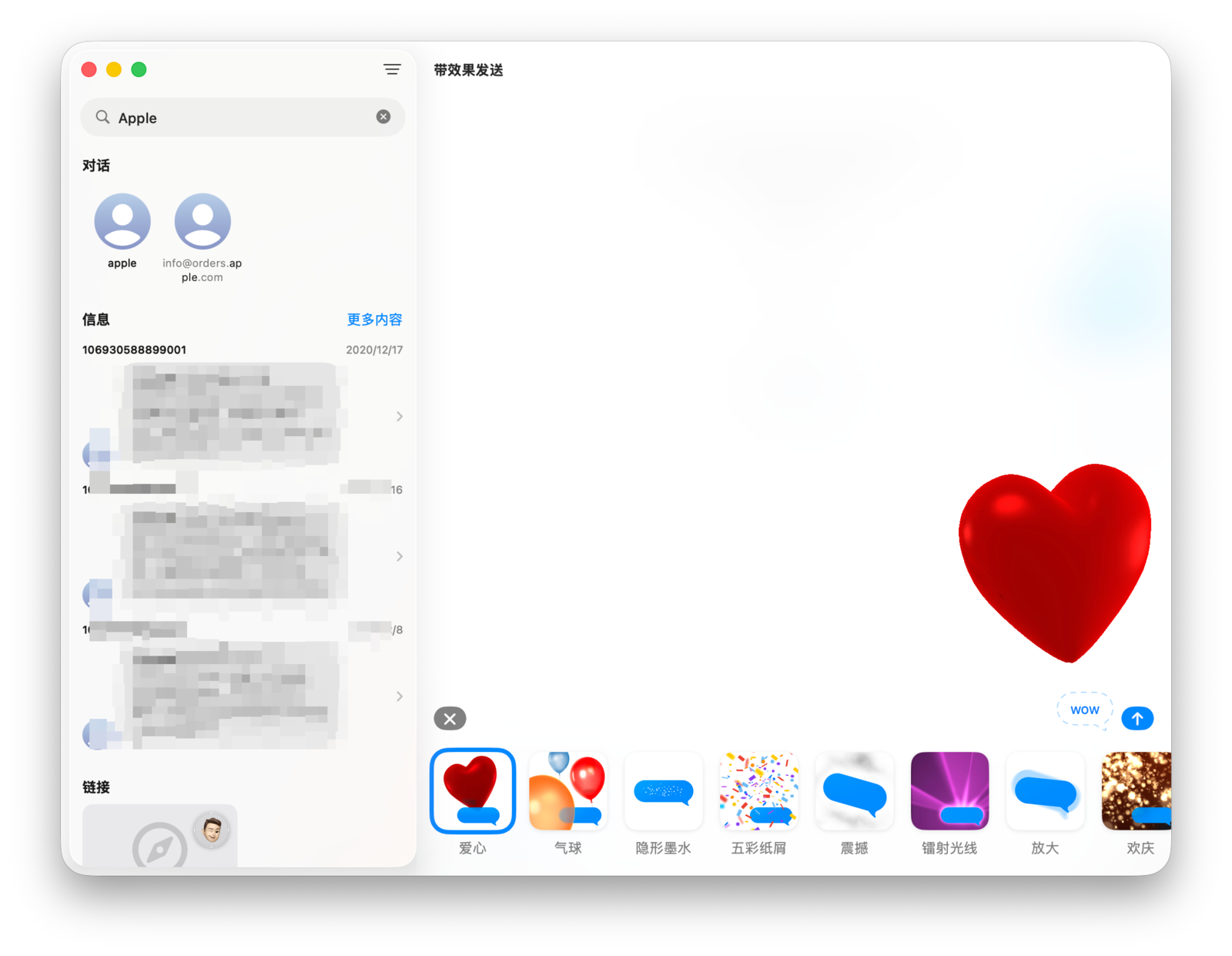 当输入栏有内容时,点击左侧的 App Store 按钮,选择「#图像」,再切换到「信息效果」,就可以为信息添加爱心、五彩纸屑、镭射光线等全屏特效。发送某些特殊短语(如「恭喜发财」)时,也会自动触发相应的效果。