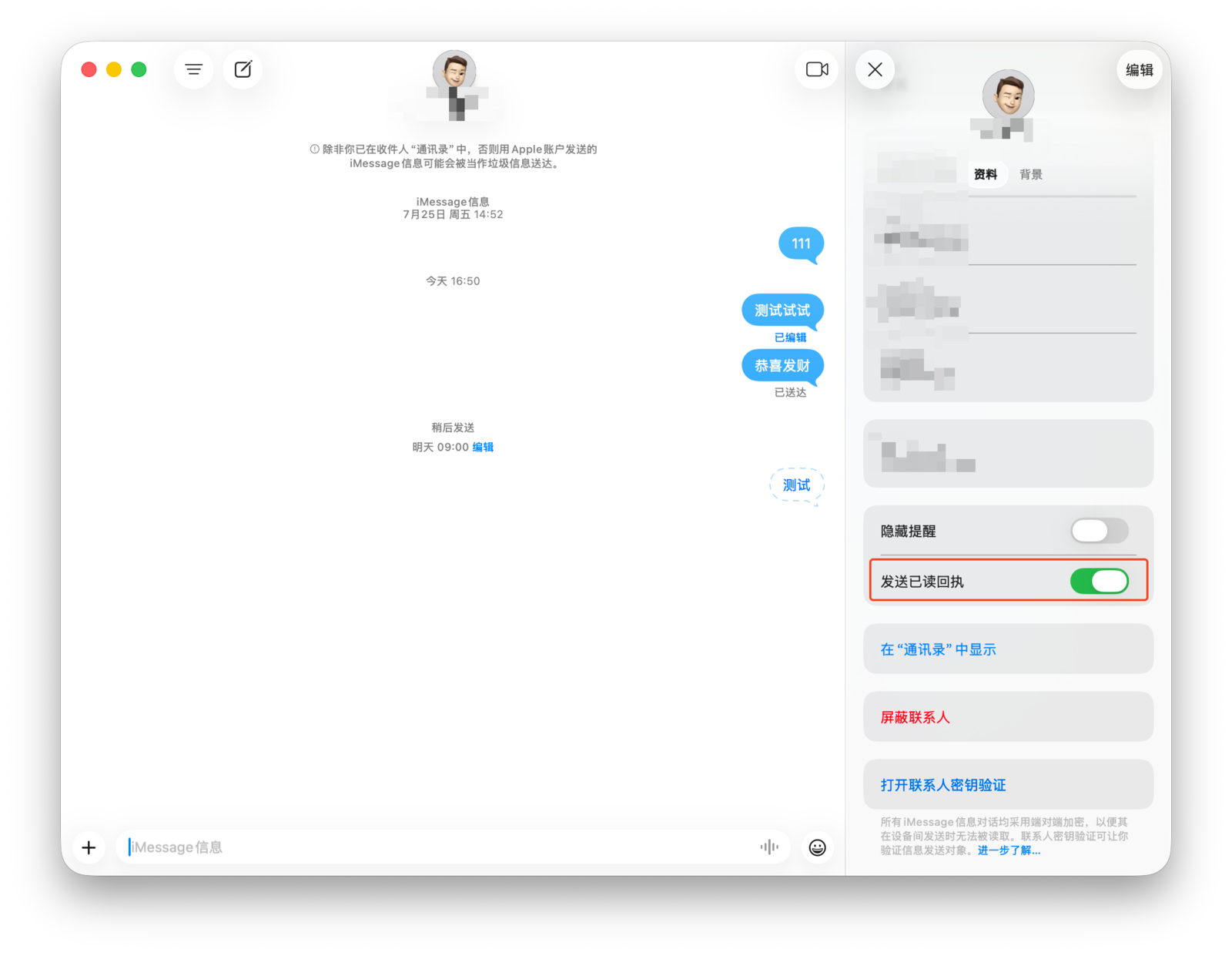 要为某个联系人单独设置,可以点击对话窗口顶部的信息区域,在详情中勾选或取消「发送已读回执」。