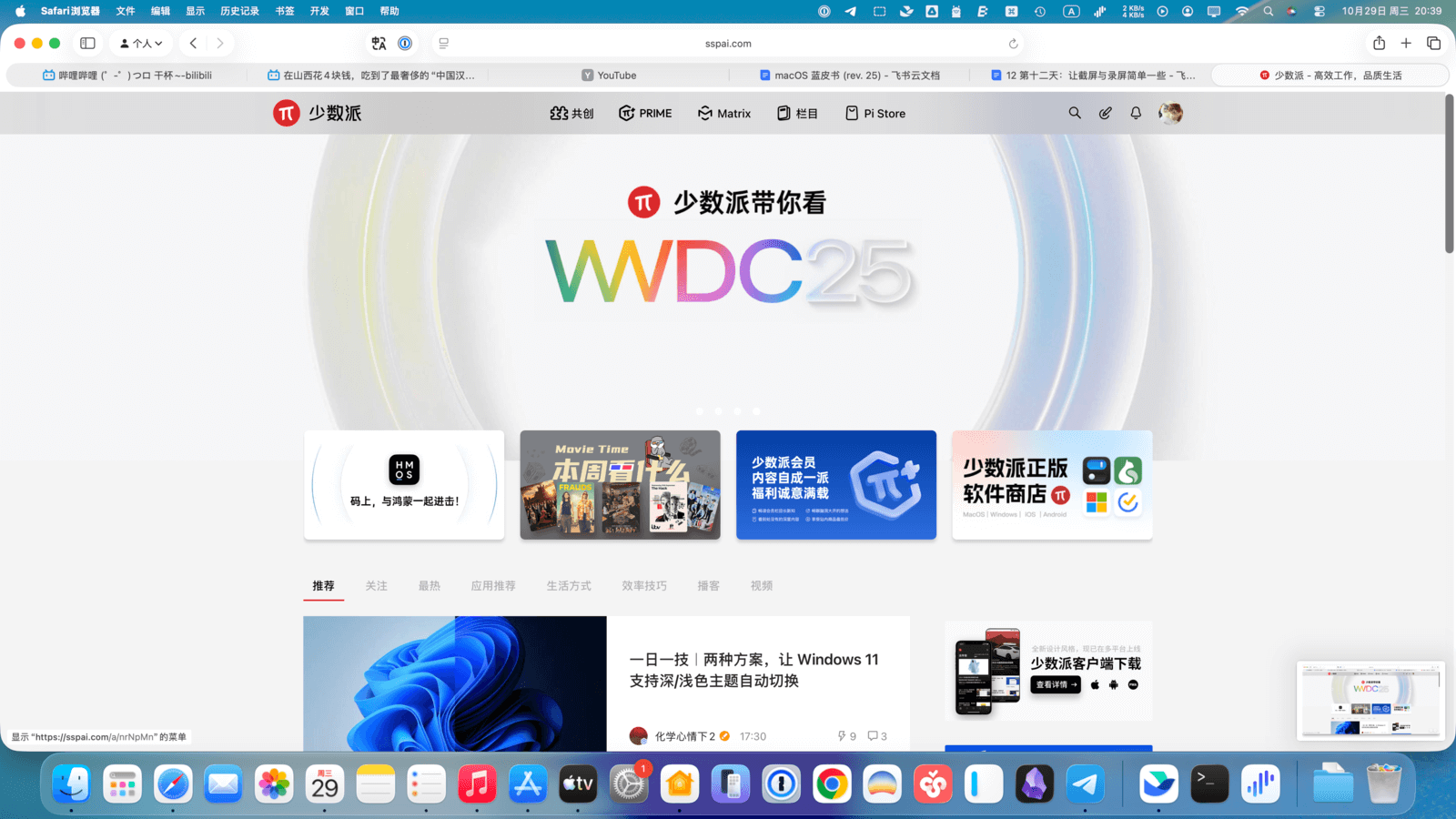 随着视频内容的普及,录屏在工作和生活中的需求也越来越高。macOS 的录屏功能同样提供两种模式:「录制整个屏幕」和「录制所选部分」。和截屏类似,你可以在「选项」菜单中设置存储位置、计时器和浮动缩略图。此外,还可以选择麦克风来源或开启鼠标点按效果——后者在录制教学视频时尤其有用。