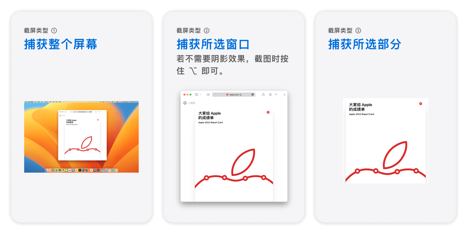 截屏服务包含三种选择:「捕捉整个屏幕」、「捕捉所选窗口」和「捕捉所选部分」,导出的图片均为 PNG 格式。其中,「捕捉所选窗口」截下的图片会保留窗口阴影,看起来更具质感。如果不想保留阴影,截图时按住 ⌥Option 键即可。