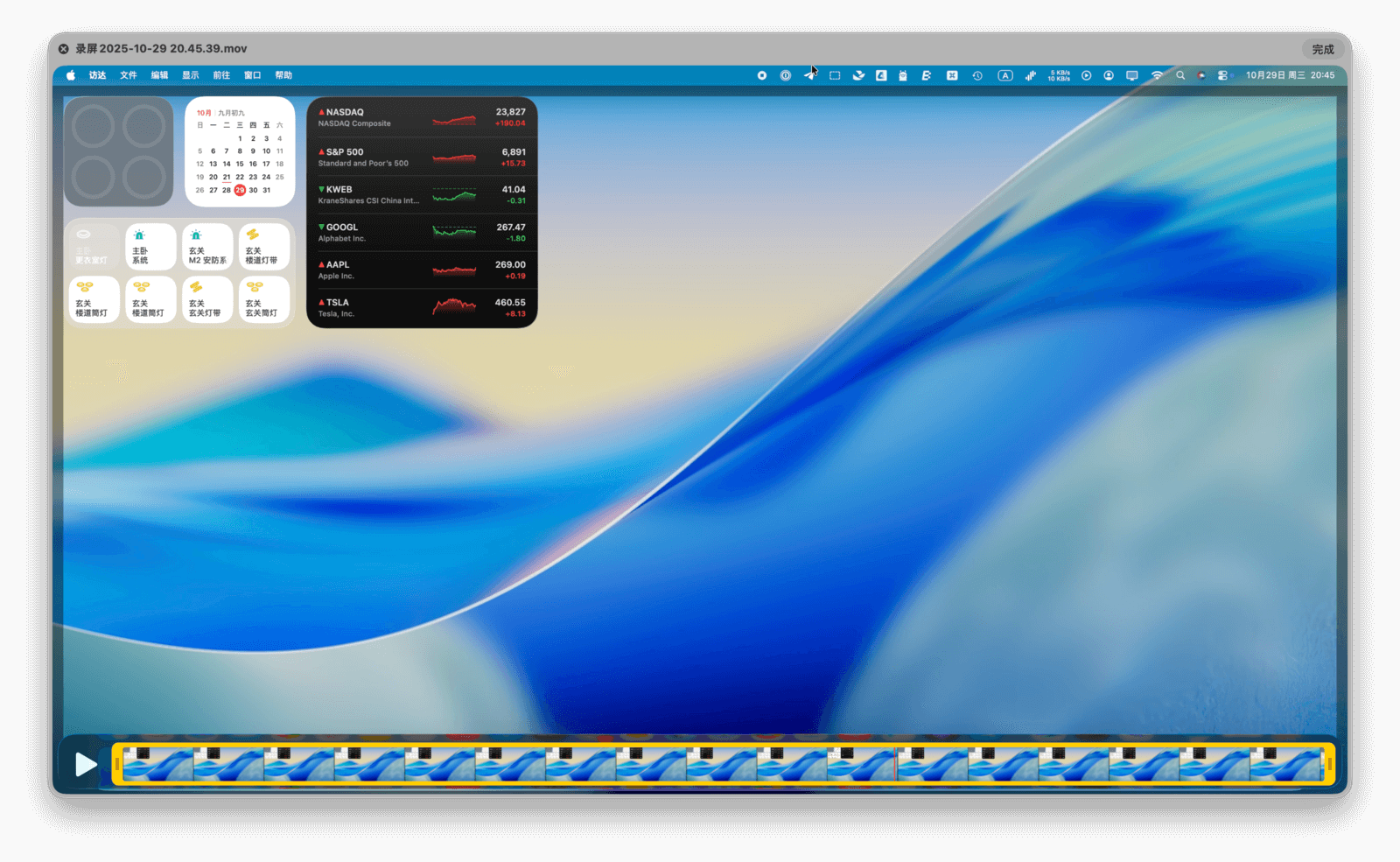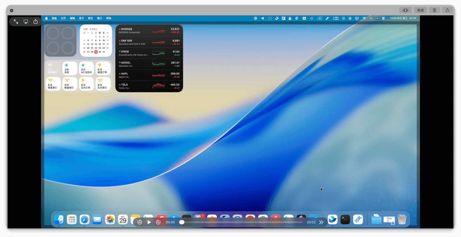 选择录屏模式后,点击工具栏上的「录制」按钮即可开始。录制期间,菜单栏上会出现一个「停止」按钮,点击即可结束录制。录制完成后,视频的缩略图会显示在屏幕右下角。