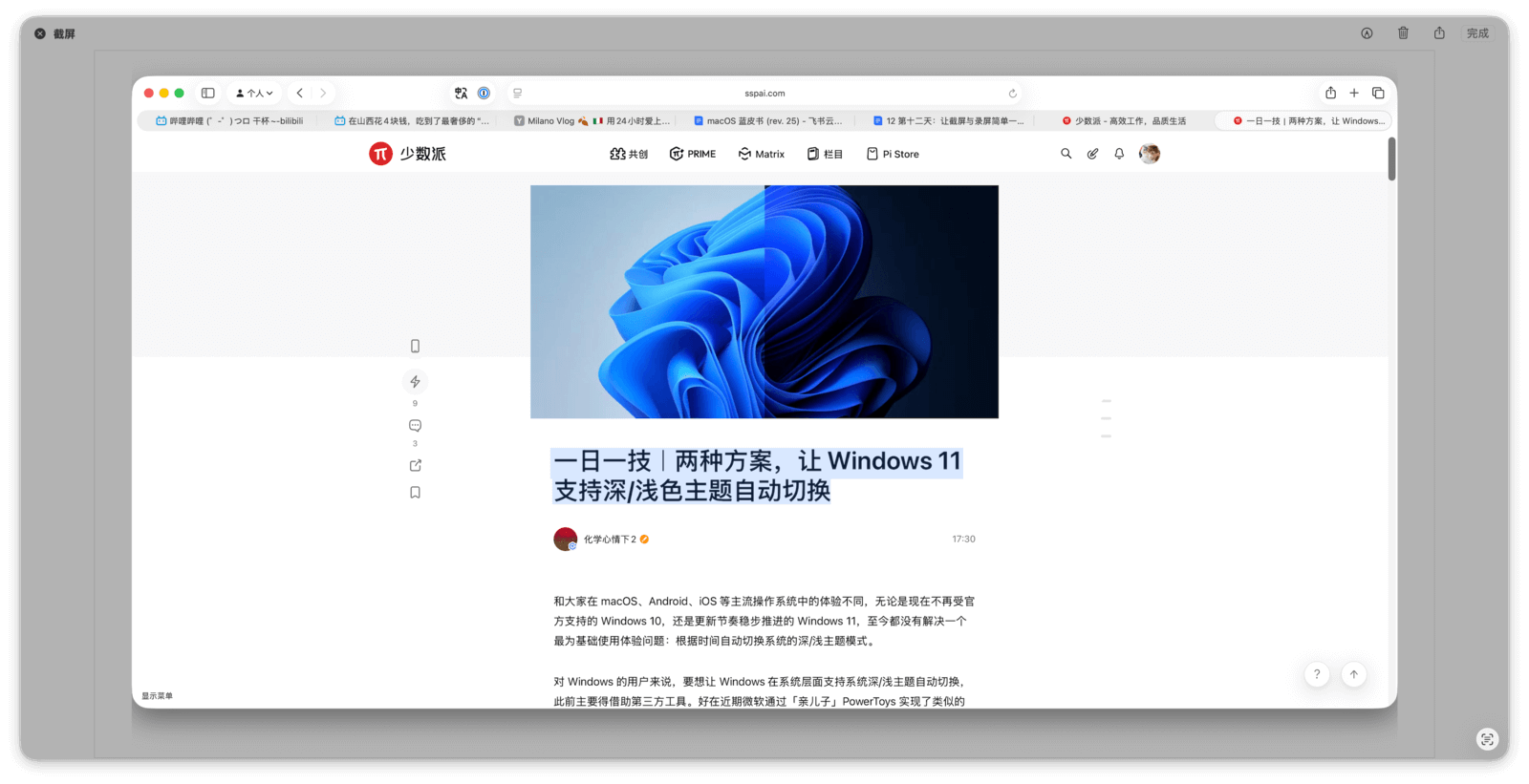 你还可以开启「浮动缩略图」功能,这与 iOS 上的体验非常相似。开启后,截屏完毕时桌面右下角会短暂出现一张缩略图。很多时候,你截图只是为了临时使用,并不想保存文件。此时,可以直接将这个缩略图拖拽到目标位置(例如聊天对话框),图片便不会存到本地,免去了事后删除的麻烦。
