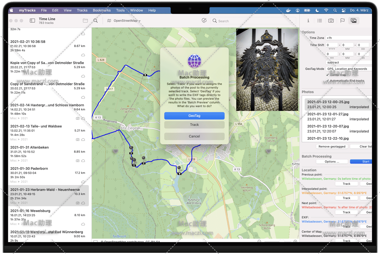 MyTracks for Mac 是一款在macOS上运行的GPS跟踪应用程序。该应用程序使用设备的GPS收集数据,允许实时查看路径、速度、距离和海拔。myTracks支持各种GPS记录器,以便将GPS轨迹传输到Mac。之后,您可以对您的照片文件进行地理标记,即将GPS位置写入您的照片。myTracks支持JPEG文件格式和各种RAW格式。