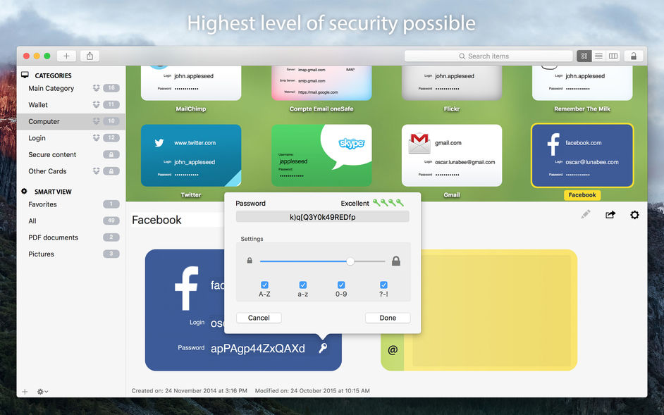 Onesafe for Mac 是一款可在某个绝对安全的位置存储所有个人机密信息(包括秘密图片和文档)的超安全密码管理应用程序。本应用程序拥有时尚的设计、适应性强的模板和直观的用户界面,简单易用,可让你轻松快速地锁定和检索个人信息。